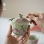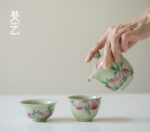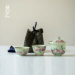 This portable tea set is small and lightweight, making it easy to carry in a backpack or suitcase. The shape of the tea ware is harmonious and sleek, and the glaze layer of the Ru kiln process is thin and shiny. The pot and cup body are painted with longevity peaches, which means “longevity, auspiciousness, perfection and health”.