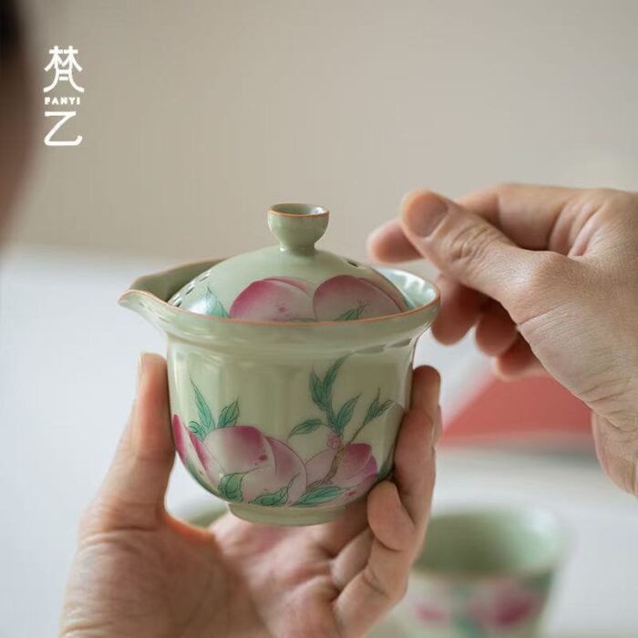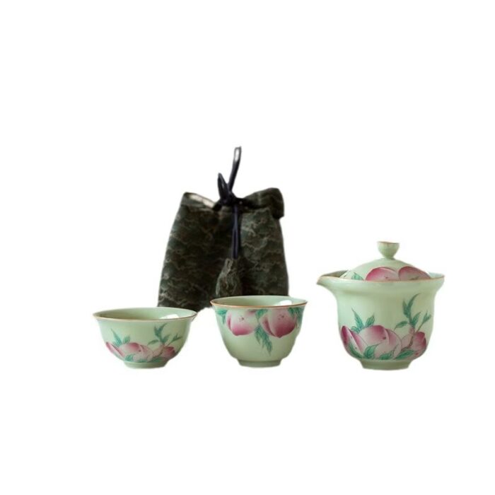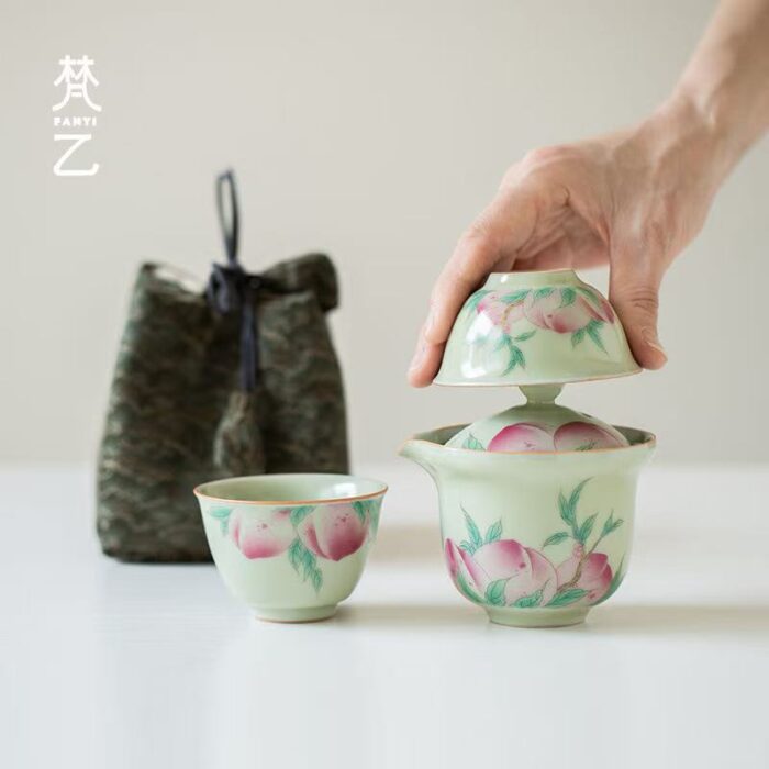 This portable tea set is small and lightweight, making it easy to carry in a backpack or suitcase. The shape of the tea ware is harmonious and sleek, and the glaze layer of the Ru kiln process is thin and shiny. The pot and cup body are painted with longevity peaches, which means “longevity, auspiciousness, perfection and health”.
