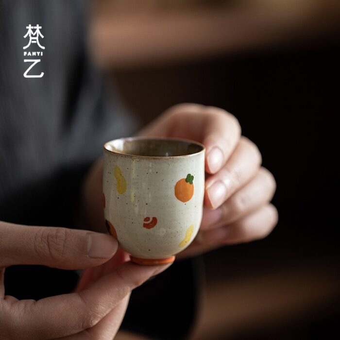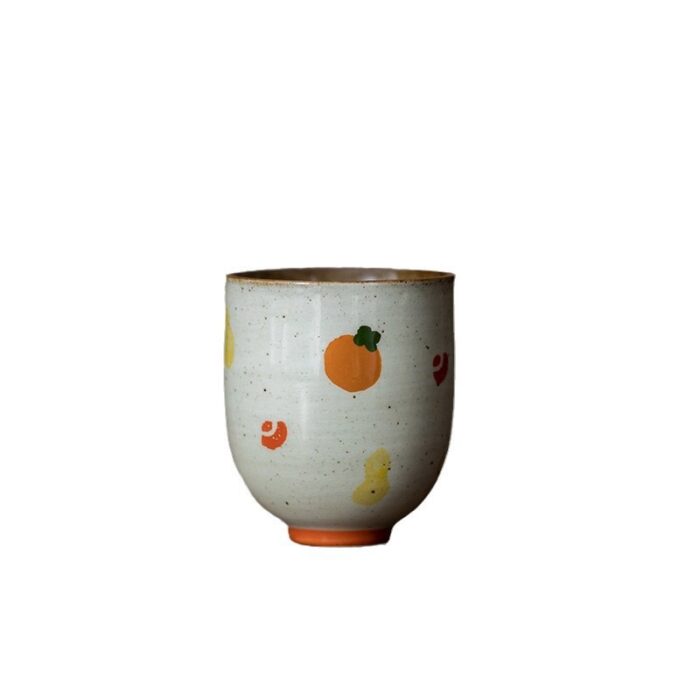 This incredibly adorable coarse pottery persimmon cup features unique hand-painted patterns. The paintings on each cup are vivid and full of artistic charm. Made of coarse pottery material, the cup feels substantial in the hand and exudes a unique rustic charm that is characteristic of coarse pottery. With a capacity of 60 ml, it is just the right size, making it perfect for drinking tea or coffee.