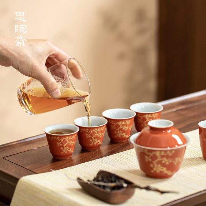 This tea set comes in a beautiful carrying case that contains a full range of tea making utensils, with a gaiwan for making tea, with a capacity of 110ml. The cup is painted with a welcome pine, which in China symbolizes hospitality and friendship. There are 4 tasting cups that can be used to entertain many guests, and there is also a smelling cup so that you can smell the aroma at the bottom of the cup when you finish your tea. As well as 1 fair mug that is easy to share tea, the whole set of tea utensils is also beautiful at home as a work of art.