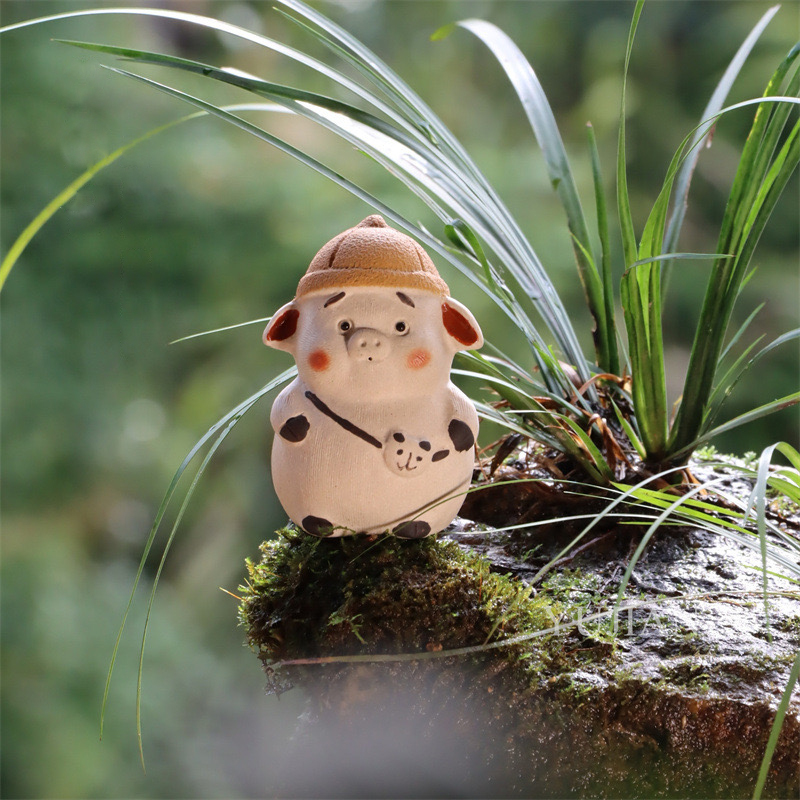 This cartoon pig tea pet wears a small yellow hat and a panda bag. Its eyes are depicted as cute, looking straight at you. It is of a moderate size, placed just right on the edge of the tea table, and has a very textured texture to play with in your hand. In the Chinese zodiac, different animals have their own meanings, and the pig represents abundance and auspiciousness.