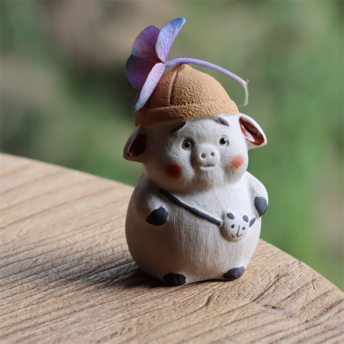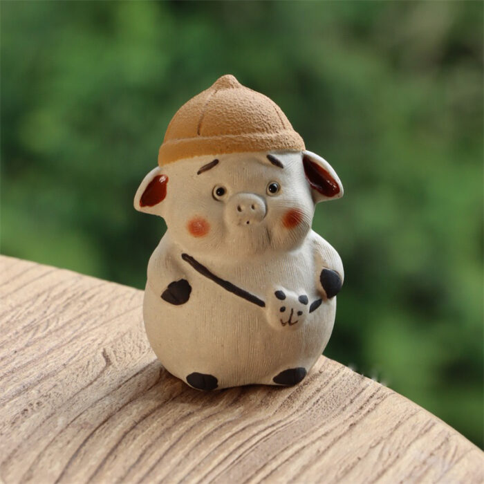 This cartoon pig tea pet wears a small yellow hat and a panda bag. Its eyes are depicted as cute, looking straight at you. It is of a moderate size, placed just right on the edge of the tea table, and has a very textured texture to play with in your hand. In the Chinese zodiac, different animals have their own meanings, and the pig represents abundance and auspiciousness.