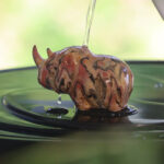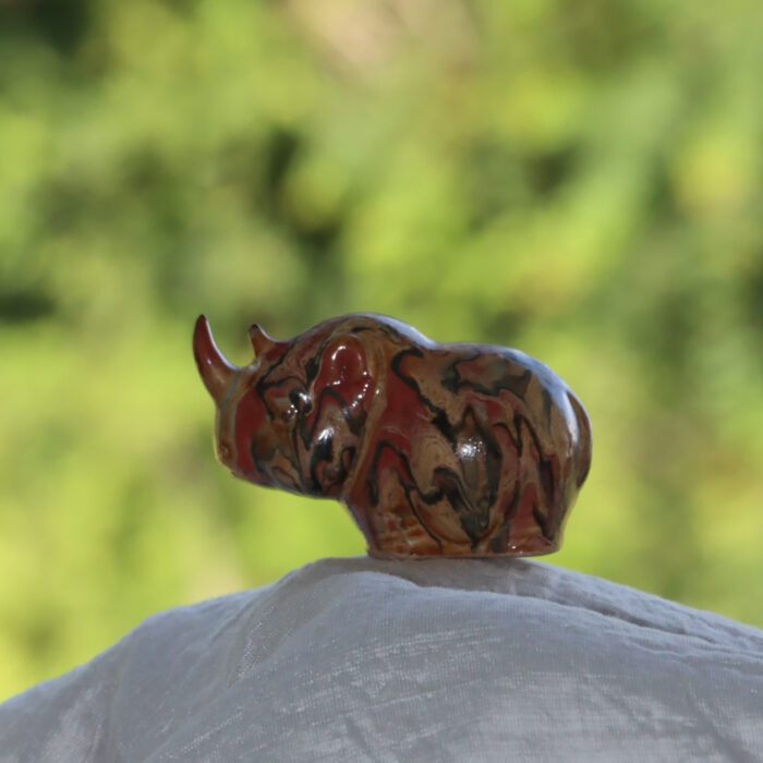 This rhinoceros tea pet is the work of a young female artist. Its demeanor is vivid and lovely. The most distinctive feature is that the artist used the colors of the Chinese Dunhuang murals on it. Therefore, the high-temperature firing oil painting style, with rich color layers, is very artist’s personal style. The rhinoceros means “good things happen” in China, and pouring tea soup on it every day may bring good luck.