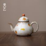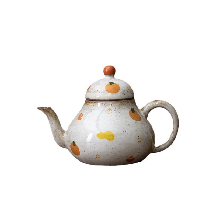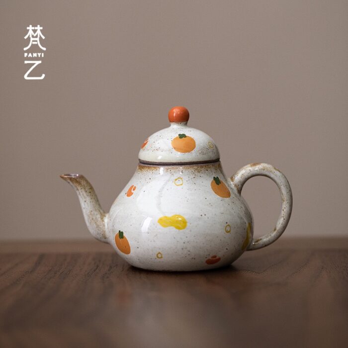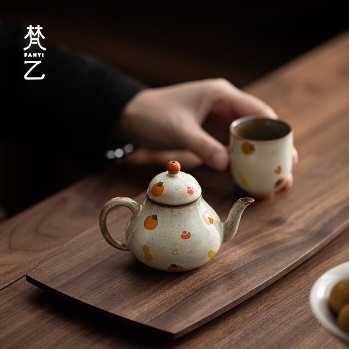 If you are looking for a teapot that combines practicality and ornamental value, you might as well take a look at this pear-shaped coarse pottery teapot. The lines of its body are soft and smooth, and it feels comfortable to hold. When used together with the same style of hand-painted persimmon cups, the visual unity of the whole tea set will be stronger. When drinking tea, it is as if you are in a persimmon forest full of fruits, and from brewing the tea to sipping it, there is a strong sense of ritual and poetry.
