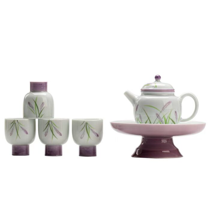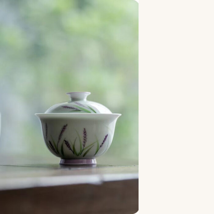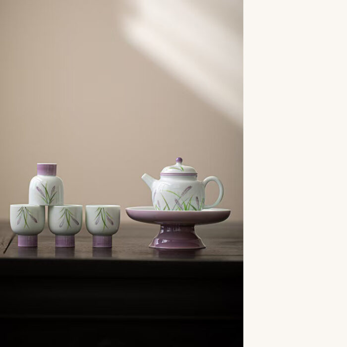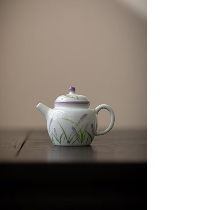 This teacup is crafted from high-quality clay, fired at high temperatures for a durable texture. Despite its tall base, it remains stable and flat. The exterior features hand-painted lavender, adding a romantic touch. The white interior highlights the tea’s color, enhancing both visual and taste experiences. Its slender, classical design makes it versatile for any tea table.