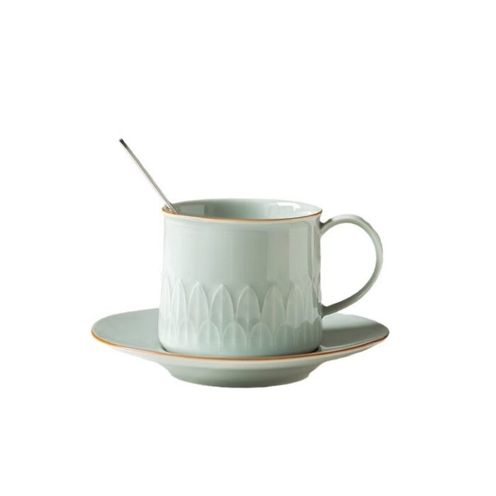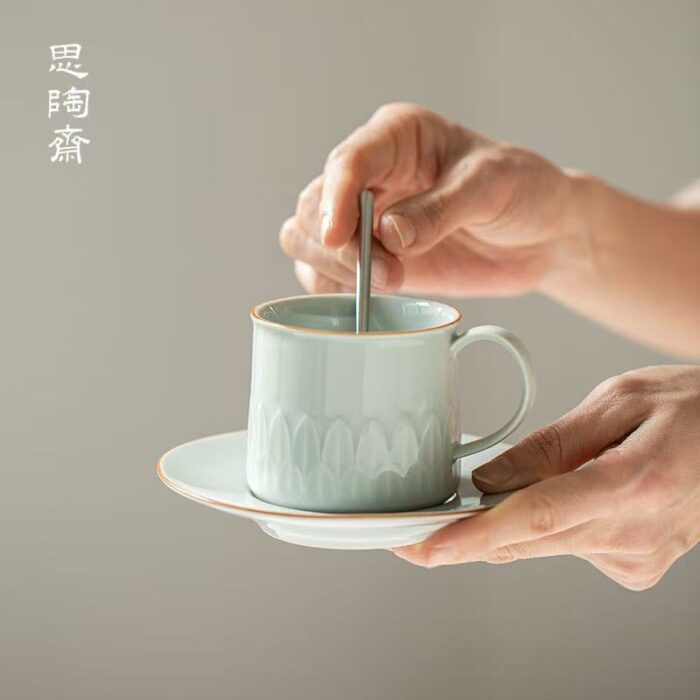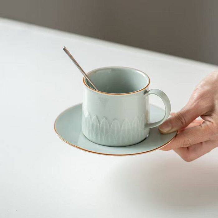 If you are used to drinking drinks from mugs and love Chinese porcelain, then you must try this. This mug is embossed with lotus petal patterns in Chinese aesthetics around the body. The lines are clear and the shape is simple and elegant. The coaster is equipped with a card slot design, so that the cup can be placed smoothly, and can also be used as a snack plate. The handle is round and comfortable to hold.